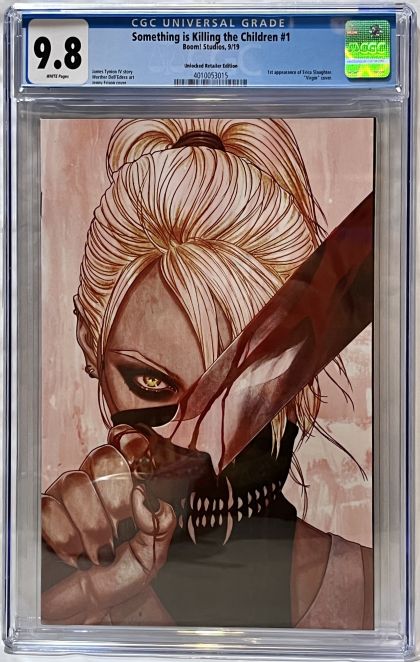 | Grader Notes | CGC Cert # 4010053015 Title Something is Killing the Children Issue 1 Issue Date 9/19 Issue Year 2019 Publisher Boom! Studios Variant Unlocked Retailer Edition Grade 9.8 Page Quality WHITE Grade Date 11/09/2022 Grade Category Modern Art Comments James Tynion IV story Werther Dell'Edera art Jenny Frison cover Key Comments 1st appearance of Erica Slaughter. ""Virgin"" cover. Grader Notes Unavailable |