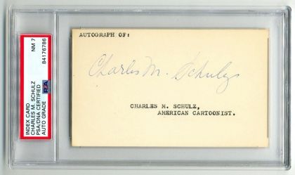 | Grader Notes | Schulz Charles Charles Schulz Signature, PSA Slabbed & Graded NM 7 A card signed by Charles Schulz (1922-2000), creator of the popular comic strip Peanuts, as "Charles M. Schulz" at top center. PSA slabbed and graded NM 7. The partly typed card is lightly toned, else near fine. Slab measures 7.125" x 4.125". This item comes with a Certificate from John Reznikoff, a premier authenticator for both major 3rd party authentication services, PSA and JSA (James Spence Authentications), as well as numerous auction houses. |