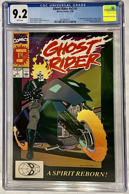 | Grader Notes | CGC Cert # 4010052017 Title Ghost Rider Issue v2 #1 Issue Date 5/90 Issue Year 1990 Publisher Marvel Comics Grade 9.2 Page Quality WHITE Grade Date 11/22/2022 Grade Category Modern Art Comments Howard Mackie story Javier Saltares & Mark Texeira art Javier Saltares cover Key Comments 1st appearance Dan Ketch as Ghost Rider. 1st appearance of Deathwatch. Kingpin appearance. Grader Notes Unavailable |