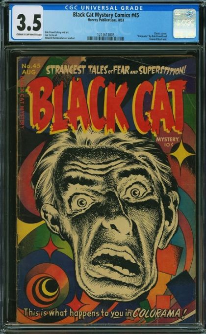 | Grader Notes | CGC 3.5 - 1213613005 CGC Cert # 1213613005 Title Black Cat Mystery Comics Issue 45 Issue Date 8/53 Issue Year 1953 Publisher Harvey Publications Grade 3.5 Page Quality CREAM TO OFF-WHITE Grade Date 11/03/2016 Grade Category Universal Art Comments Bob Powell story and art Joe Certa art Howard Nostrand cover and art Key Comments ""Colorama"" by Bob Powell and Howard Nostrand. Classic cover. Grader Notes multiple tear with crease back cover tanning interior cover tear right center of front cover tear with crease top of front cover |