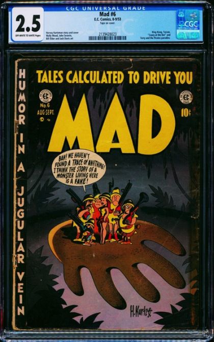| Grader Notes | CGC Cert # 2139428023 Title Mad Issue 6 Issue Date 8-9/53 Issue Year 1953 Publisher E.C. Comics Grade 2.5 Page Quality OFF-WHITE TO WHITE Grade Date 2020-07-01 Grade Category Universal Label Text Tape on cover. Art Comments Harvey Kurtzman story and cover Wally Wood, John Severin, Bill Elder and Jack Davis art Key Comments King Kong, Tarzan, "Casey at the Bat" and Terry and the Pirates parodies. Grader Notes cover detached botom staple tape cover moderate creasing to cover moderate tears to cover moderate bends to cover moderate spine stress lines to cover light cover tanning light staining to cover light foxing to cover |