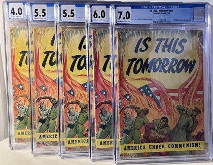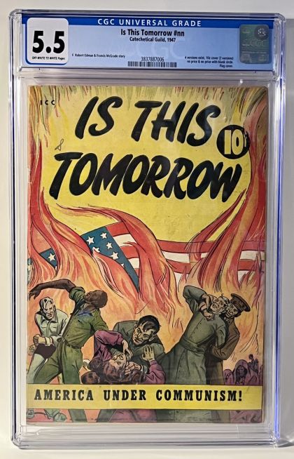Is This Tomorrow #1 Group of 5 (Catechetical Guild, 1947) Condition: Average VG. Burning American flag cover. Anti-Communism propaganda comic; used in Parade of Pleasure on page 102. Gerber rates this a "7" ("scarce") in its rarity index. Approximate Overstreet value for group = $375. From the Philip M. Levine Collection.