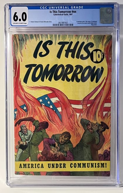 Is This Tomorrow #1 Group of 5 (Catechetical Guild, 1947) Condition: Average VG. Burning American flag cover. Anti-Communism propaganda comic; used in Parade of Pleasure on page 102. Gerber rates this a "7" ("scarce") in its rarity index. Approximate Overstreet value for group = $375. From the Philip M. Levine Collection.