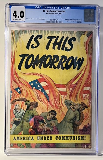 Is This Tomorrow #1 Group of 5 (Catechetical Guild, 1947) Condition: Average VG. Burning American flag cover. Anti-Communism propaganda comic; used in Parade of Pleasure on page 102. Gerber rates this a "7" ("scarce") in its rarity index. Approximate Overstreet value for group = $375. From the Philip M. Levine Collection.