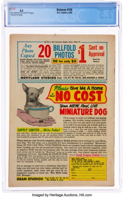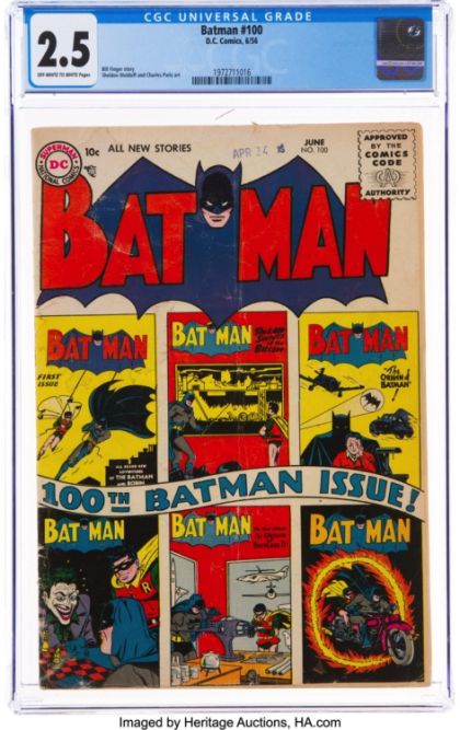 | Grader Notes | CGC 2.5 - 1972711016 Title: Batman Issue: 100 Issue Date: 6/56 Issue Year: 1956 Publisher: D.C. Comics Grade: 2.5 Page Quality: OFF-WHITE TO WHITE Grade Date: 12/29/2020 Grade Category: Universal Art Comments: Bill Finger story Sheldon Moldoff and Charles Paris art |