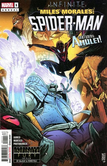 FIGHT AT THE MUSEUM! Miles Morales is investigating a series of monster attacks in Brooklyn when he runs into Ms. Marvel's friend and ally AMULET! Together they connect the monsters to a series of cursed magical objects. But who activated them, and why? And can Spider-Man and Amulet find out before the monsters take them down too? ALSO IN THIS ISSUE: Part 6 (of 8) of 'Infinite Fury'! Rated T+