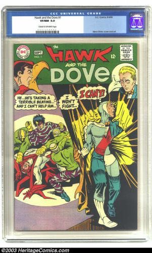 Hawk and Dove #1 (DC, 1968) CGC VF/NM 9.0 Cream to off-white pages. Steve Ditko cover and art. Overstreet 2003 VF/NM 9.0 value = $80; NM 9.4 value = $100.