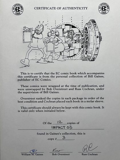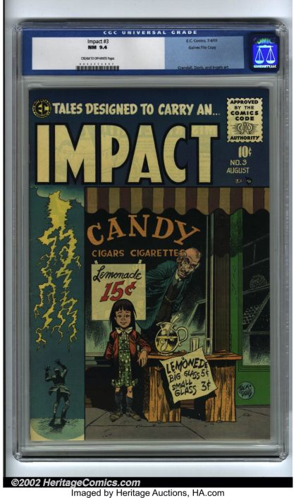 Impact #3 Gaines File pedigree 3/12 (EC, 1955) CGC NM 9.4 Cream to off-white pages. By taking one look at these comics, it's easy to see why the Gaines File Copies are in such high demand -- these books are smoking hot. Condition is very consistent from book to book, with sharp corners, nice spines, and rich cover colors and gloss being the rule, rather than the exception. This copy is a prize waiting to be captured by some lucky collector. Overstreet 2002 NM 9.4 value = $100.
