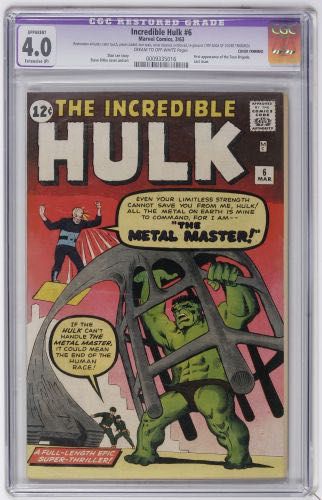 The Incredible Hulk #6 (Marvel, 1963) CGC Apparent VG 4.0 Cream to off-white pages. Last issue of the original series. First appearance of the Teen Brigade. Steve Ditko cover and art. CGC notes, "Restoration includes: color touch, pieces added, tear seals, cover cleaned, reinforced, re-glossed. (TOP EDGE OF COVER TRIMMED)." Overstreet 2006 GD 2.0 value = $171; VG 4.0 value = $342.