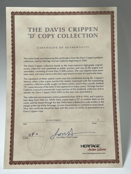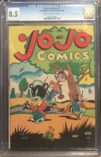 | Grader Notes | CGC Cert # 0152124004 Title Jo-Jo Comics Issue 2 Issue Date Summer 1946 Issue Year 1946 Publisher Fox Features Synd. Grade 8.5 Page Quality CREAM TO OFF-WHITE Grade Date 06/13/2008 Grade Category Universal Pedigree Davis Crippen (""D"" Copy) Grader Notes Unavailable Total Graded by CGC In 8.5: 1 In Higher Grades: 1 |