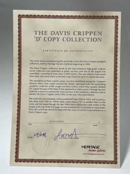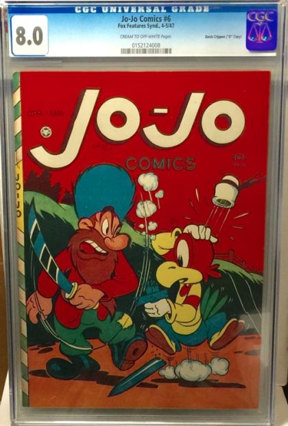 | Grader Notes | CGC Cert # 0152124008 Title Jo-Jo Comics Issue 6 Issue Date 4-5/47 Issue Year 1947 Publisher Fox Features Synd. Grade 8.0 Page Quality CREAM TO OFF-WHITE Grade Date 06/13/2008 Grade Category Universal Pedigree Davis Crippen (""D"" Copy) Grader Notes Unavailable Total Graded by CGC In 8.0: 1 In Higher Grades: 0 Top Pop |
