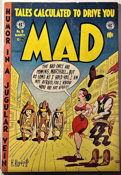 MAD #9 (EC, 1954) Condition: VG. Harvey Kurtzman cover. Little Orphan Annie parody with Wally Wood art. Parody of Edgar Allan Poe's "The Raven" with Bill Elder art. High Noon parody with Jack Davis art. Satire of "bop" language with John Severin art. Two-inch spine split at top of spine. Overstreet 2021 VG 4.0 value = $120. From the Maple Leaf Collection.