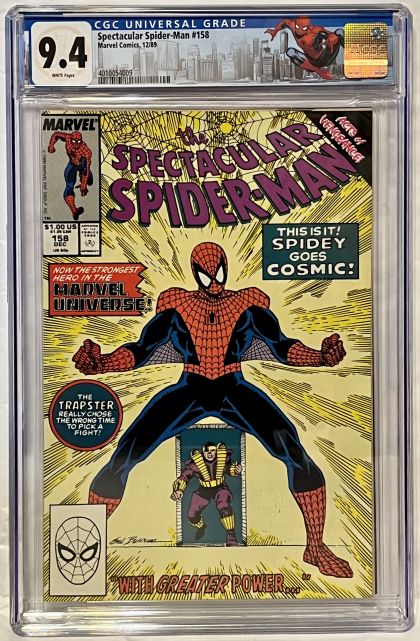 | Grader Notes | CGC Cert # 4010054009 Title Spectacular Spider-Man Issue 158 Issue Date 12/89 Issue Year 1989 Publisher Marvel Comics Grade 9.4 Page Quality WHITE Grade Date 11/02/2022 Grade Category Modern Art Comments Gerry Conway story Sal Buscema & Mike Esposito art Sal Buscema cover Key Comments Spider-Man gains cosmic powers. Trapster appearance. |