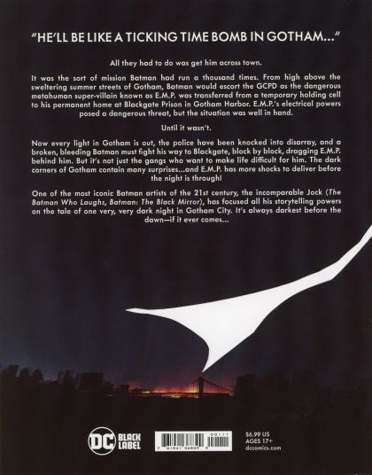 From high above the sweltering summer streets of Gotham, Batman planned to escort the GCPD as the dangerous metahuman super-villain known as E.M.P. was transferred from a holding cell to his permanent home at Blackgate Prison. E.M.P.'s electrical powers posed a threat, but the situation was in hand-until it wasn't. Now every light in Gotham is out, the police are in disarray, and a broken, bleeding Batman must fight his way to Blackgate, block by block, dragging E.M.P. behind him. But the dark corners of Gotham hold many surprises...and E.M.P. has many more shocks to deliver before the night is through! One of the most iconic Batman artists of the 21st century, the incomparable Jock (The Batman Who Laughs, Batman: The Black Mirror), has focused all his storytelling powers on the tale of one very, very dark night in Gotham City. It's always darkest before the dawn-if it ever comes...