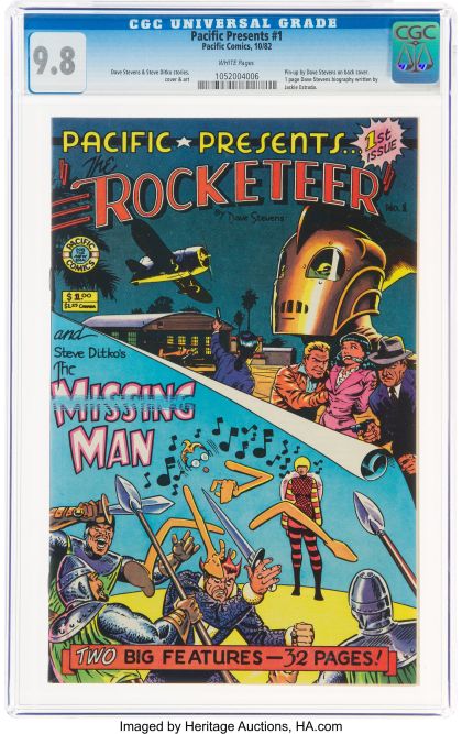 Pacific Presents #1 (Pacific Comics, 1982) CGC NM/MT 9.8 White pages. Early Rocketeer appearance. Bettie Page appearance. Dave Stevens story, cover, art, and back cover pin-up. Steve Ditko story and art. Overstreet 2021 NM- 9.2 value = $24. CGC census 4/22: 116 in 9.8, none higher.