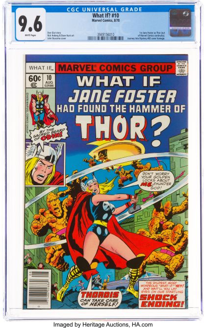 | Grader Notes | CGC Cert # 3949156010 Title What If? Issue 10 Issue Date 8/78 Issue Year 1978 Publisher Marvel Comics Grade 9.6 Page Quality WHITE Grade Date 10/25/2021 Grade Category Modern Art Comments Don Glut story Rick Hoberg & Dave Hunt art John Buscema cover Key Comments 1st Jane Foster as Thor (out of Marvel Comics continuity). Journey Into Mystery #83 cover homage. Grader Notes light bend full top of front cover through book very light, multiple bend full right of front cover. What If? #10 (Marvel, 1978) CGC NM+ 9.6 White pages. "What If Jane Foster Had Found the Hammer of Thor?" -- a very hot book due to the upcoming Thor: Love and Thunder feature film. John Buscema cover. Overstreet 2021 NM- 9.2 value = $150. CGC census 4/22: 275 in 9.6, 148 higher. Sold on Apr 18, 2022 for: $408.00 includes Buyer's Premium (BP) |