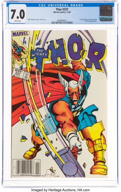 | Grader Notes | Thor #337 (Marvel, 1983) CGC FN/VF 7.0 White pages. This first appearance of Beta Ray Bill. Cover by Walt Simonson, and the first issue of his run as series writer/artist. Overstreet 2021 FN 6.0 value = $24; VF 8.0 value = $54. CGC census 4/22: 127 in 7.0, 6680 higher. CGC Cert # 4000060013 Title Thor Issue 337 Issue Date 11/83 Issue Year 1983 Publisher Marvel Comics Grade 7.0 Page Quality WHITE Grade Date 02/04/2022 Grade Category Modern Art Comments Walt Simonson story, cover & art Key Comments 1st appearance of Beta Ray Bill. Nick Fury appearance. Grader Notes crease bottom of back cover crease left center of back cover crease left top of back cover. Sold on Apr 18, 2022 for: $124.00 includes Buyer's Premium (BP) |