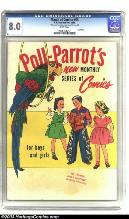 March of Comics #68 Roy Rogers (K. K. Publications, Inc., 1951) CGC VF 8.0 White pages. CGC notes, " "Poll-Parrot" promotional outer cover 5.0, cover 8.0." This currently holds first place in grade among all copies of issue #68 in CGC's census. Overstreet 2003 VF 8.0 value = $121.