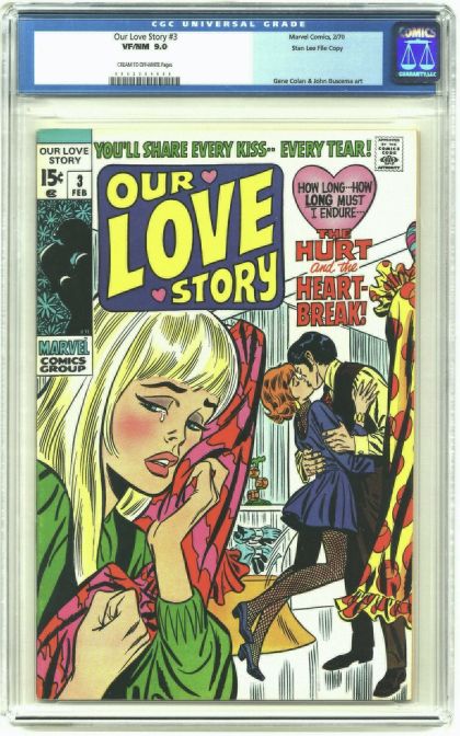 Our Love Story #3 Stan Lee File Copy (Marvel, 1970) CGC VF/NM 9.0 Cream to off-white pages. Extra nice copy from Stan's files. Because he referred to these issues periodically, most of Stan's copies are in lesser condition than this high-grade prize. Gene Colan and John Buscema contribute art. Overstreet 2003 VF/NM 9.0 value = $24; NM 9.4 value = $28.