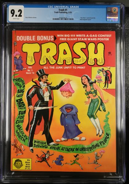 | Grader Notes | CGC Cert # 4424524016 Title Trash Issue 1 Issue Date 3/78 Issue Year 1978 Publisher Trash Publishing Grade 9.2 Page Quality WHITE Grade Date 07/23/2024 Grade Category Modern Art Comments Tony Tallarico stories Key Comments ""Star Wars"" poster & parody. Mad magazine spoof. Grader Notes light spine stress lines to cover |