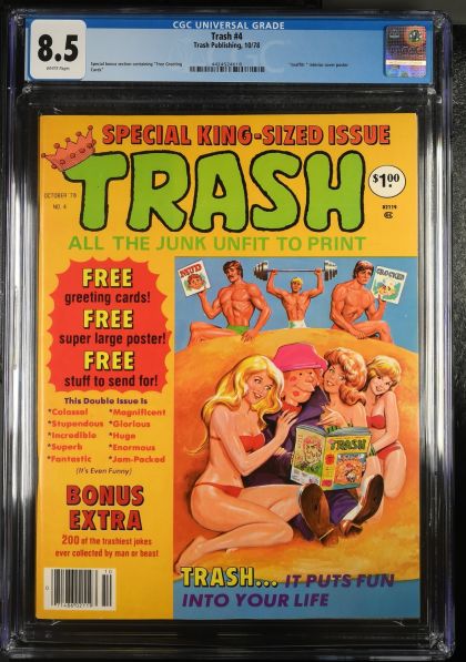 | Grader Notes | CGC Cert # 4424524018 Title Trash Issue 4 Issue Date 10/78 Issue Year 1978 Publisher Trash Publishing Grade 8.5 Page Quality WHITE Grade Date 07/23/2024 Grade Category Modern Art Comments Special bonus section containing ""Free Greeting Cards"" Key Comments ""Graffiti "" interior cover poster Grader Notes light creasing to cover |