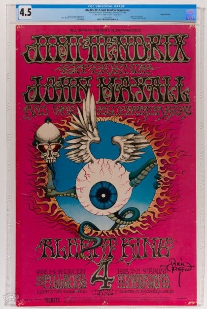 | Grader Notes | --CRITICAL DETAILS-- --TITLE: Bg-105 --GRADE: 4.5 --PERFORMERS: Jimi Hendrix --VENUE: Winterland --CITY: San Francisco --DATE: 02/01/68 --PRINTING: RP-2; RP2 Poster --CGC SERIAL: 2510485002 |