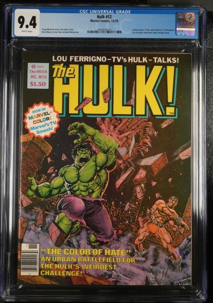 | Grader Notes | CGC Cert # 4424524010 Title Hulk Issue 12 Issue Date 12/78 Issue Year 1978 Publisher Marvel Comics Grade 9.4 Page Quality WHITE Grade Date 07/23/2024 Grade Category Modern Art Comments Doug Moench story, Joe Jusko cover Ron Wilson, Ernie Chan & Keith Pollard art Key Comments Indicia states 11/78, John Romita Jr. frontispiece Lou Ferrigno interview, Moon Knight story. Grader Notes very light bends to cover very light wear to cover |