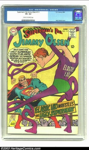 Superman's Pal Jimmy Olsen #111 (DC, 1968) CGC VF+ 8.5 Cream to off-white pages. Neal Adams cover; Elastic Lad wrestles the ugly Superman. Overstreet 2002 VF 8.0 value = $17; NM 9.4 value = $25.