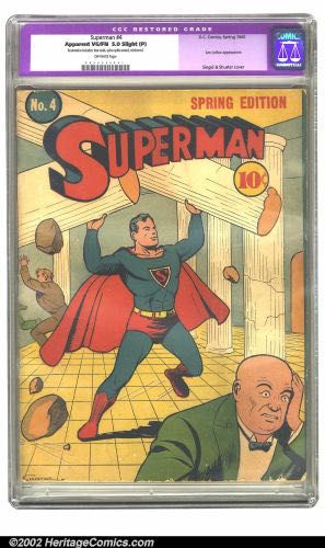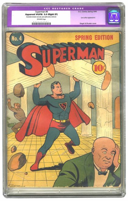| Grader Notes | CGC 5.0 Restored - 0035355001 CGC Cert # 0035355001 Title Superman Issue 4 Issue Date Spring 1940 Issue Year 1940 Publisher D.C. Comics Grade 5.0 Page Quality OFF-WHITE Grade Date 09/13/2001 Grade Category Apparent SP Label Text Restoration includes: tear seals, spine splits sealed, reinforced. Art Comments Jerry Siegel story Paul Cassidy and Sheldon Moldoff art Joe Shuster cover and art Key Comments 2nd appearance of Luthor. 2 Luthor stories. Grader Notes Bottom Front Cover Stain Front Cover Lite Crease Right Bottom Front Cover Wear Spine Wear |