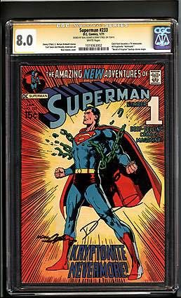 | Grader Notes | CGC 8.0 SS - 1019363002 CGC Cert # 1019363002 Title Superman Issue 233 Issue Date 1/71 Issue Year 1971 Publisher D.C. Comics Grade 8.0 Page Quality WHITE Grade Date 10/01/2010 Grade Category Signature Label Text SIGNED BY NEAL ADAMS & DENNY O'NEIL ON 7/24/10 Art Comments Denny O'Neil, E. Nelson Bridwell stories Curt Swan and Murphy Anderson art Neal Adams cover Key Comments Clark Kent becomes a TV newscaster. All Kryptonite ""destroyed"". ""World of Krypton"" backup stories begin. Grader Notes Unavailable |