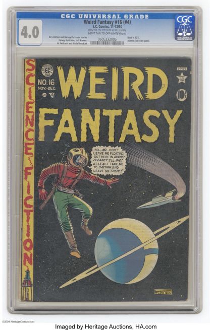 Weird Fantasy #16 (#4) Al Williamson File Copy (EC, 1950) CGC VG 4.0 Light tan to off-white pages. Harvey Kurtzman's story in this 1950 issue takes place in 1970. It predicts: "Television is now everywhere! Every country in the world, every home, every person, watches television!" In addition to that prophetic piece, the issue has an Al Feldstein cover, and art by Feldstein, Jack Kamen, and Wally Wood. The issue was mentioned in Seduction of the Innocent. Overstreet 2004 VG 4.0 value = $118. Comes with an attractive certificate of authenticity for The Al Williamson Collection, signed by Al himself.