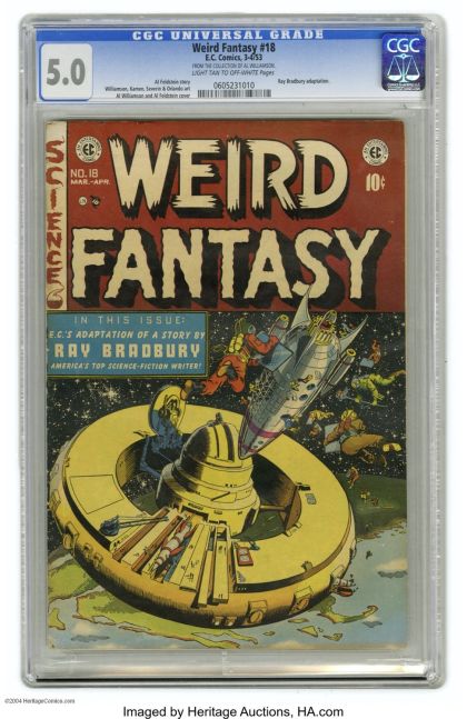 Weird Fantasy #18 Al Williamson File Copy (EC, 1953) CGC VG/FN 5.0 Light tan to off-white pages. Al Williamson teamed up with several other artists during his stellar EC days, sometimes as the penciler, sometimes as the inker, and sometimes doing both. The result was always stunning. Here he created the cover with inking help from Al Feldstein, and contributed story art with inking by Roy Krenkel. Jack Kamen, Joe Orlando, and the team of John Severin and Bill Elder also penciled interior stories for this issue. Overstreet 2004 VG 4.0 value = $62; FN 6.0 value = $93. Comes with an attractive certificate of authenticity for The Al Williamson Collection, signed by Al himself.