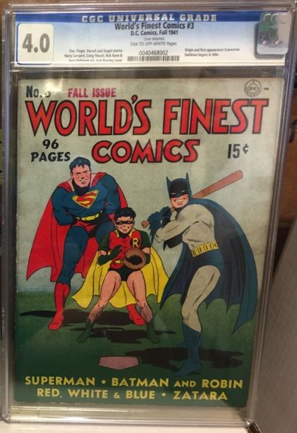 World's Finest Comics #3 (DC, 1941) CGC VG 4.0 Tan to off-white pages. Origin and first appearance Scarecrow. Sandman begins in title. Jack Burnley cover. Bob Kane, Jerry Robinson, and Creig Flessel art. Overstreet 2004 VG 4.0 value =$652.
