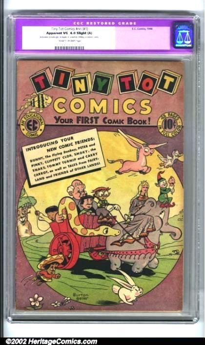 Tiny Tot Comics nn (#1) (EC, 1946). CGC Apparent VG 4.0 Slight (A) Cream to off-white pages. Restoration includes: glue at staples of centerfold. (Writing on interior covers) Overstreet 2001 GD 2.0 value = $36; FN 6.0 value = $108. Overstreet 2002 GD 2.0 value = $38; FN 6.0 value = $114.