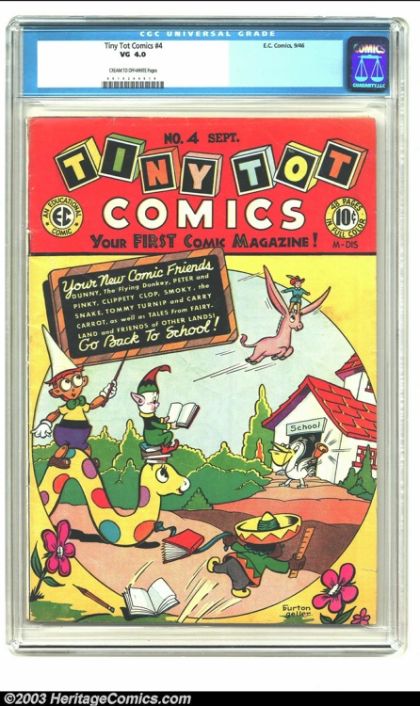 Tiny Tot Comics #4 (EC, 1946) CGC VG 4.0 Cream to off-white pages. Features Dunny, the flying donkey, Peter and Pinky, Clippety Clop, Smoky, the snake, Tommy Turnip, Carry Carrot and Tales from Fairyland. Overstreet 2003 VG 4.0 value = $40.