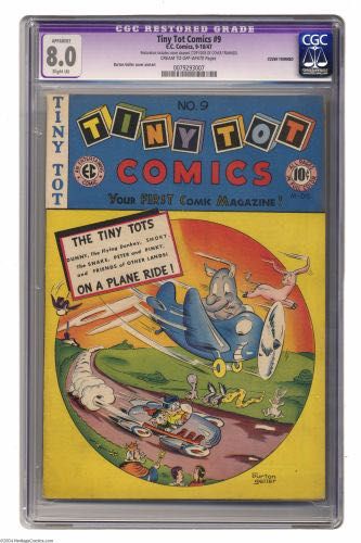 Tiny Tot Comics #9 (EC, 1947) CGC Apparent 8.0 Slight (A) Cream to off-white pages. Burton Geller cover and art. CGC notes: "Restoration includes: cover cleaned. Top edge of cover trimmed". The highest graded copy CGC has yet to certify of issue #9. Overstreet 2004 VF 8.0 value =$112.