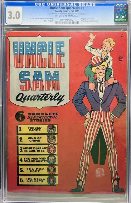 Uncle Sam Quarterly #1 (Quality, 1941) CGC GD/VG 3.0 Off-white to white pages. Origin of Uncle Sam. Lou Fine and Will Eisner cover. Fine, Eisner, and Dave Berg art. CGC notes, "2 pieces of tape on interior cover, two pieces of tape on centerfold." Overstreet 2006 GD 2.0 value = $381; VG 4.0 value = $762. CGC census 9/06: 2 in 3.0, 12 higher.