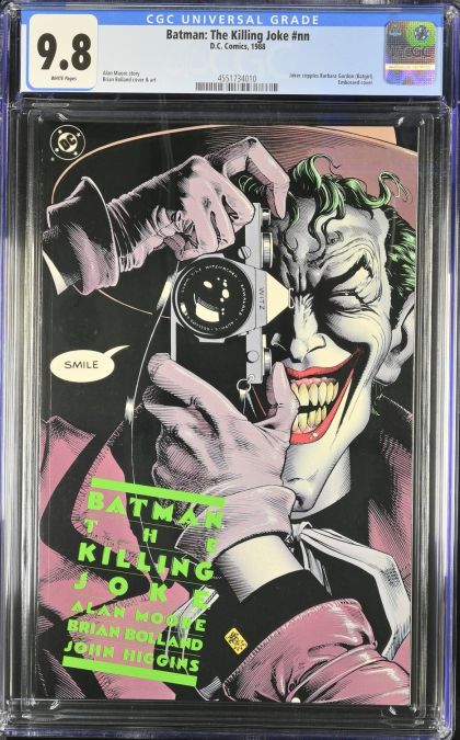 | Grader Notes | CGC Cert # 4551734010 Title Batman: The Killing Joke Issue nn Issue Date 1988 Issue Year 1988 Publisher DC Comics Grade 9.8 Page Quality WHITE Grade Date 2025-04-09 Label Category Universal Art Comments Alan Moore story Brian Bolland cover & art Key Comments Joker cripples Barbara Gordon (Batgirl). Embossed cover. |