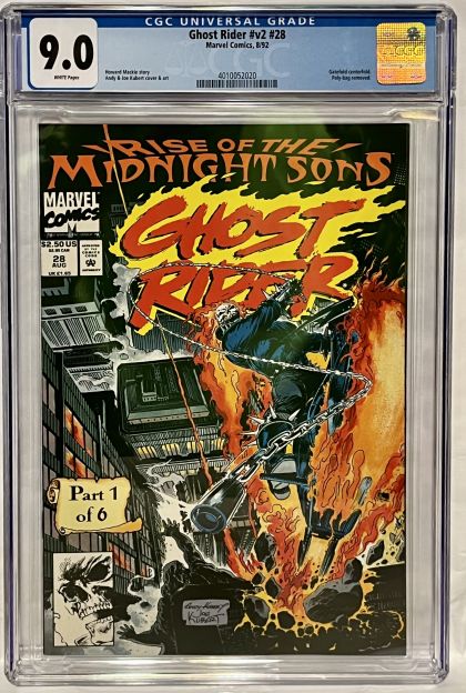 | Grader Notes | CGC Cert # 4010052020 Title Ghost Rider Issue v2 #28 Issue Date 8/92 Issue Year 1992 Publisher Marvel Comics Grade 9.0 Page Quality WHITE Grade Date 11/22/2022 Grade Category Modern Art Comments Howard Mackie story Andy & Joe Kubert cover & art Key Comments Gatefold centerfold. Poly-bag removed. Grader Notes staple tear top staple light spine stress lines to cover |