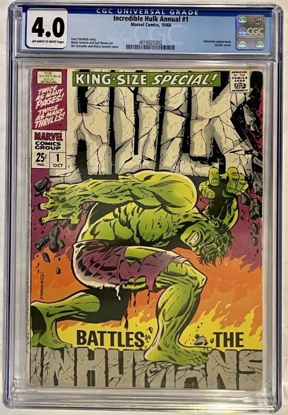 | Grader Notes | CGC Cert # 4010025002 Title Incredible Hulk Annual Issue 1 Issue Date 10/68 Issue Year 1968 Publisher Marvel Comics Grade 4.0 Page Quality OFF-WHITE TO WHITE Grade Date 11/01/2022 Grade Category Universal Art Comments Gary Friedrich story Marie Severin and Syd Shores art Jim Steranko and Marie Severin cover Key Comments Inhumans appearance. Classic cover. Grader Notes tape pull back cover creasing to cover light staining to cover soiling on cover spine splits to cover spine stress lines to cover |