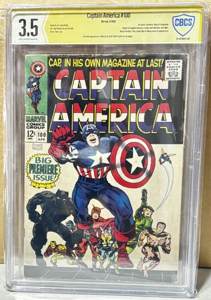 | Grader Notes | Captain America #100 Marvel4 1968 Variant: Pedigree: 3.5 Verified Off-White/White Signees: Verified Signatures: STAN LEE & JACK KIRBY (both on 1st page). Notes: signature(s) verified by BAS spine stress, wear & creases to cover breaks color tiny tears to edges front & back cover couple small stains to cover |