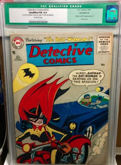 | Grader Notes | CGC Cert # 0035468004 Title Detective Comics Issue 233 Issue Date 7/56 Issue Year 1956 Publisher D.C. Comics Grade 6.0 Page Quality OFF-WHITE Grade Date 2002-06-24 Grade Category Qualified Pedigree INCOMPLETE Label Text 12TH PAGE MISSING, DOES NOT AFFECT STORY. INCOMPLETE. Art Comments Edmond Hamilton and Jack Miller stories Stan Kaye and Ruben Moreira art Sheldon Moldoff cover and art Key Comments Origin and 1st appearance of Batwoman (Kathy Kane). |