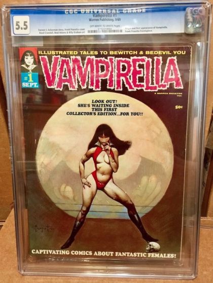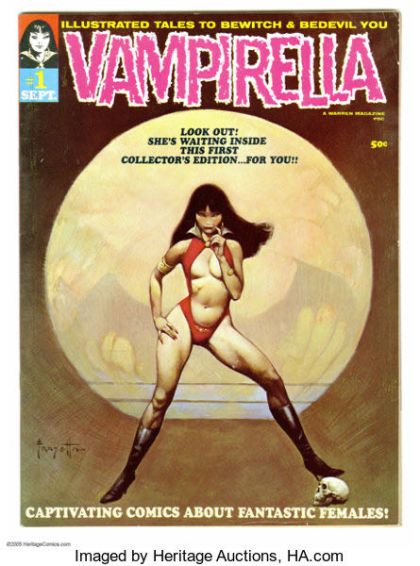 Vampirella #1 (Warren, 1969) Condition: FN. Origin and first appearance of Vampirella. Forrest J. Ackerman story. Frank Frazetta cover and frontispiece. Neal Adams and Reed Crandall art. Overstreet 2005 FN 6.0 value = $123.