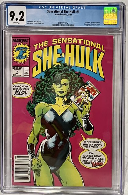 | Grader Notes | CGC Cert # 4010053014 Title Sensational She-Hulk Issue 1 Issue Date 5/89 Issue Year 1989 Publisher Marvel Comics Grade 9.2 Page Quality WHITE Grade Date 11/09/2022 Grade Category Modern Art Comments John Byrne story & cover John Byrne & Bob Wiacek art Key Comments Origin of She-Hulk retold. Ringmaster, Circus of Crime & Headmen appearance. Grader Notes Unavailable |