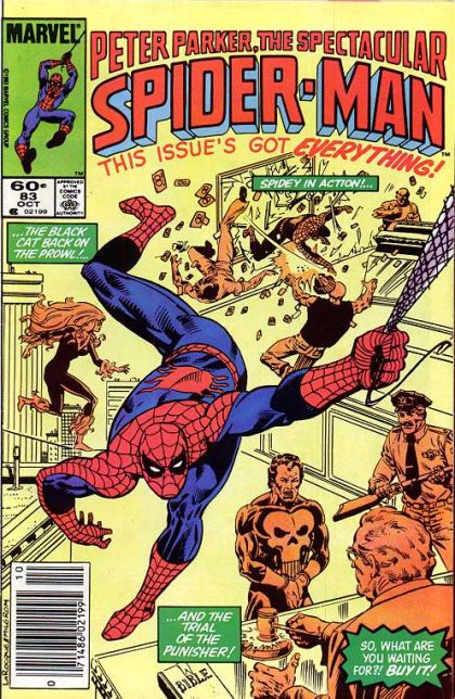 "Delusions" Part 3 of 3. Script by Bill Mantlo. Pencils by Greg LaRocque. Inks by Jim Mooney. Cover by Greg LaRocque and Al Milgrom. Peter Parker and Ben Urich attend the Punisher's arraignment hearing at the courthouse. It's a sad ending for Frank Castle as the once proud vigilante is sentenced to a mental institution for his attacks on the civilian populace. However, the one-man war against crime will return with a vengeance in his Limited Series! (Punisher 1st series 1986). Meanwhile, the Black Cat is gradually recovering from her injuries and suggests to the web-slinger the possibility of becoming his crime fighting partner. Brief origin on the Punisher. Cameo appearance by Captain Jean DeWolff. (Notes: This three-part story was reprinted in Marvel Tales 220, 221, and 222. There was some controversy at the time over the characterization (mentally unstable/borderline psychotic) of the Punisher in these issues, as his persona was somewhat different from his prior appearances.) 32 pages Reprinted in Marvel Tales # 222. Cover price $0.60.