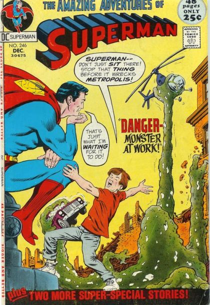 Danger: Monster At Work - Superman collects algae samples for S.T.A.R. Labs, which mutate them into atmosphere cleaning orangisms. While Clark deals with vigilantes in his apartment building, the algae gets out of control.Marriage, Kryptonian Style - On Krypton, a computer determined who should and should not be married. What happened when it told Lara and Jor-El that their marriage was forbidden?There Is No Superman - Reprinted from Superman #40