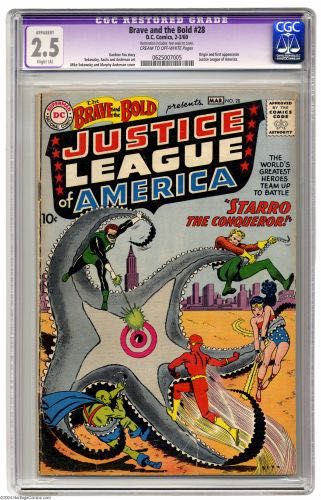 The Brave and the Bold #28 (DC, 1960) CGC Apparent GD+ 2.5 Cream to off-white pages. Origin and first appearance of the Justice League of America. First appearance of Snapper Carr. Mike Sekowsky and Murphy Anderson cover and art. CGC notes " Restoration includes: tear seals to cover". Overstreet 2004 GD 2.0 value = $390.