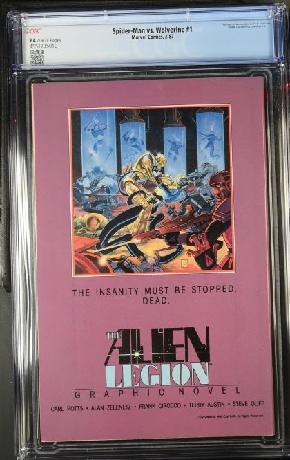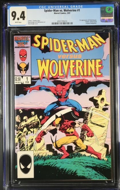 | Grader Notes | CGC Cert # 4551735010 Title Spider-Man vs. Wolverine Issue 1 Issue Date 2/87 Issue Year 1987 Publisher Marvel Comics Grade 9.4 Page Quality WHITE Grade Date 2025-04-03 Label Category Universal Art Comments James C. Owsley story Mark Bright & Al Williamson art Mark Bright cover Key Comments 1st appearance of Charlemagne. "Death" of Ned Leeds (original Hobgoblin). Grader Notes spine stress lines cover wear all corners cover |