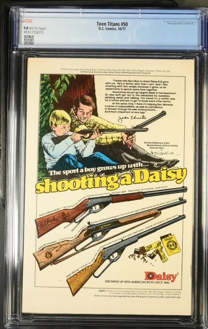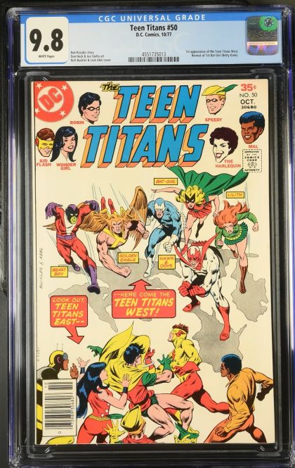 | Grader Notes | CGC Cert # 4551735013 Title Teen Titans Issue 50 Issue Date 10/77 Issue Year 1977 Publisher D.C. Comics Grade 9.8 Page Quality WHITE Grade Date 2025-04-03 Grade Category Modern Art Comments Bob Rozakis story Don Heck & Joe Giella art Rich Buckler & Jack Abel cover Key Comments 1st appearance of the Teen Titans West. Revival of 1st Bat-Girl (Betty Kane). |