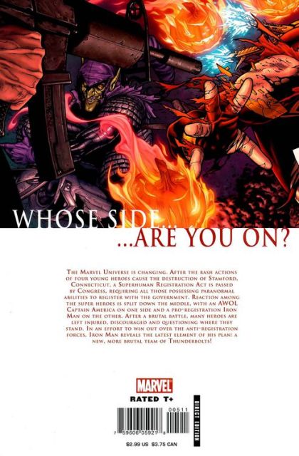 The death of Bill Foster has shaken the warring super-human community, causing allegiances to shift. Sue Richards and her brother Johnny Storm are now dodging S.H.I.E.L.D. agents, and hiding in new civillian identities while Nighthawk and Stature have turned themselves in and registered.Spider-Man has also re-thought his position in the Civil War as a result of the prison built in the Negative Zone. He's secreted Aunt May and Mary Jane out of the tower, but Tony caught onto him before he could make his own mistake. Tony thinks he can bring Peter back if he can just talk to him for a moment, but Maria Hill overrides him, deciding to test the Thunderbolts.But Tony and Maria's decision to enlist super-powered criminals creates a new enemy for them... one who not only saves Spidey's life but may be able to get Cap's forces into the Negative Zone.
